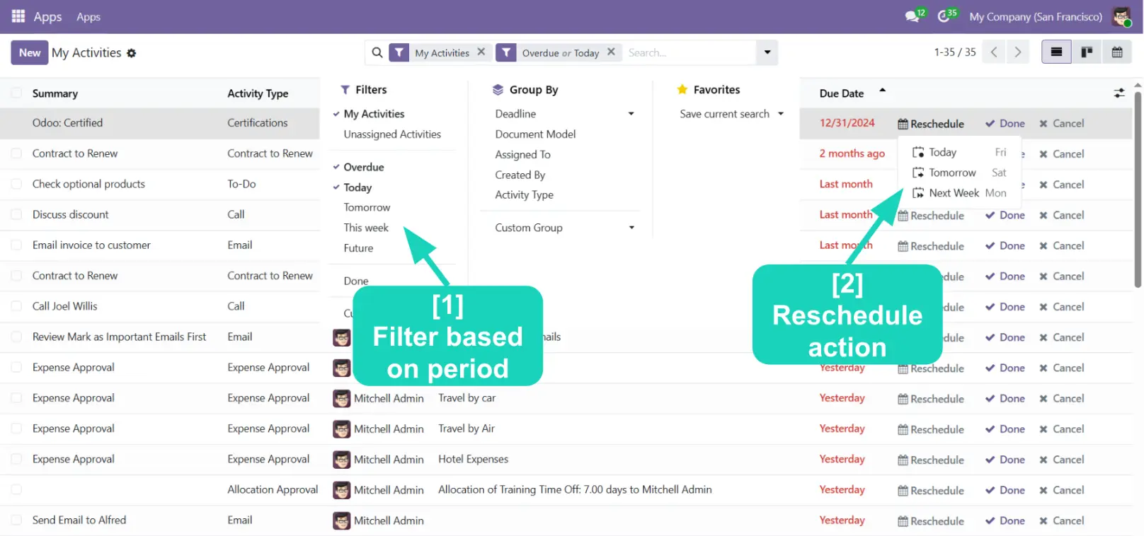 - [2] use the quick action to Reschedule to "Today", "Tomorrow", or "Next Week", giving users more control and making managing activities much easier.