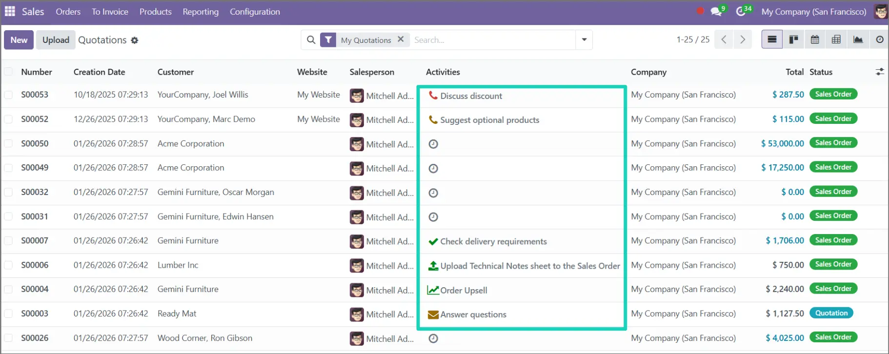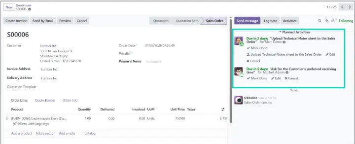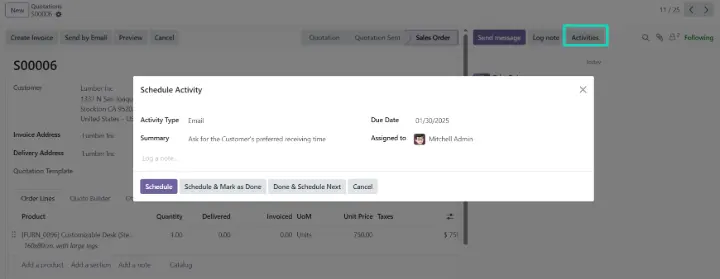 - After sending a quotation to a customer, a salesperson can schedule an activity with a deadline (e.g., 3 days later) to remind themselves to follow up if the customer hasn't responded.