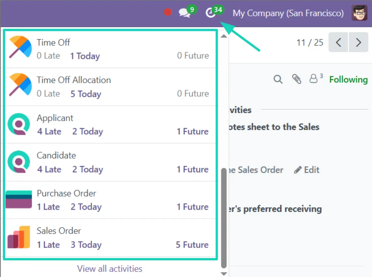 Odoo has an amazing feature called “ Activities”. They are available on form views across all models. It works like a “reminder” where you can set what to do, who will do it, and when. Then, the reminders to complete these activities can be sent to the assignee's email inbox.
