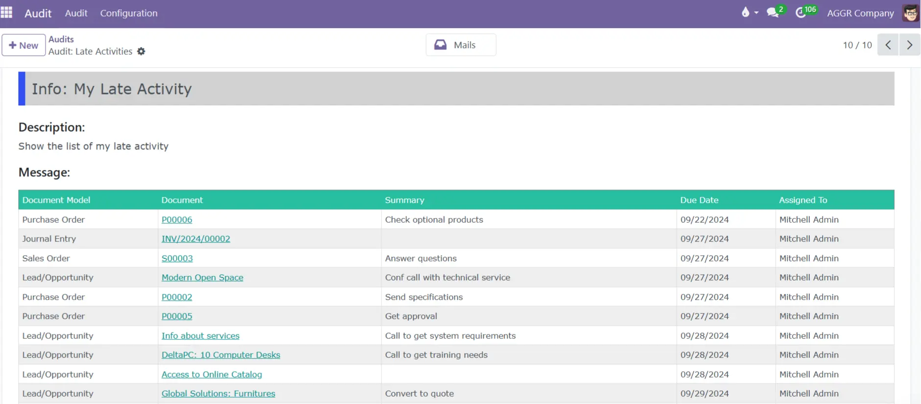 This module introduces a report which can include ‘My Late Activities’ and ‘Late Activities of my Subordinates’. This report can be printed and set with a Frequency to send this report to related employees automatically.