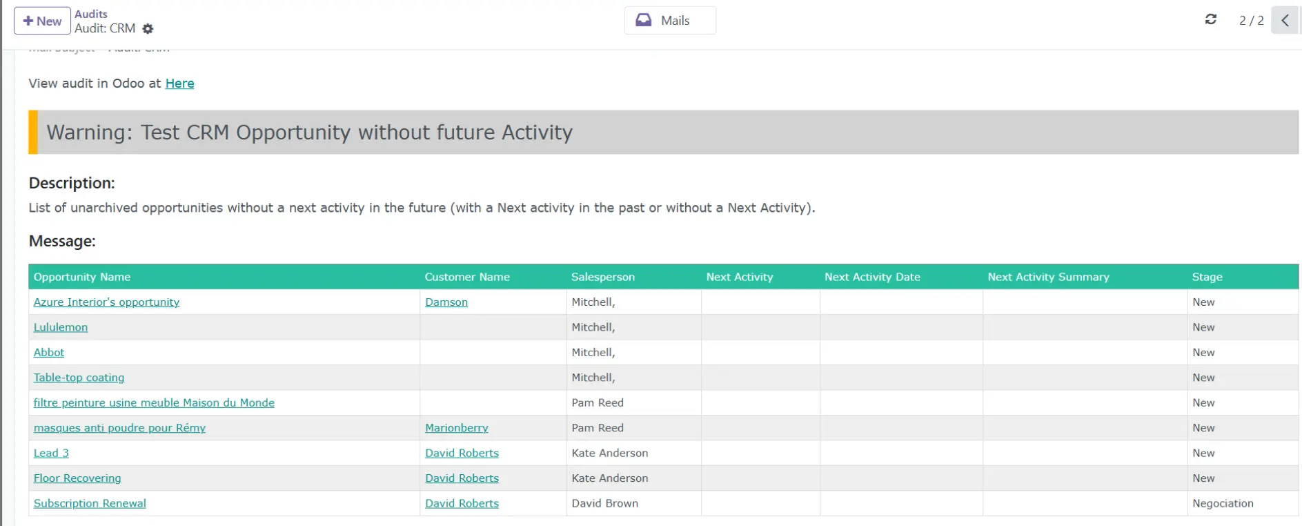 Although Odoo Activity is useful for creating reminders, they can only be viewed directly from the Odoo software. To help you better manage activities, Komit has created various audit modules that send activity reminders straight to your email inbox!